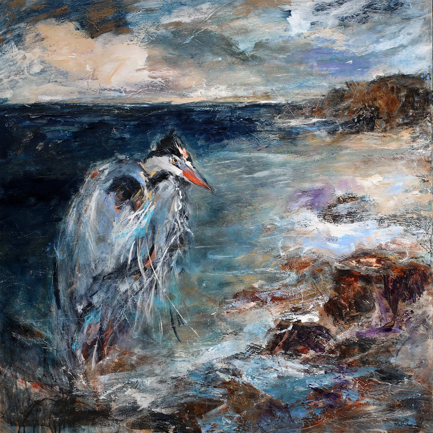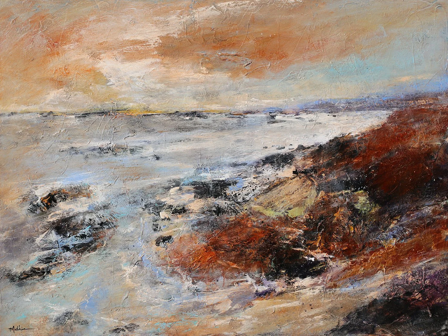 Christopher Mathie’s mixed media paintings are filled with energetic movement, fluid emotion, and bold confident brushwork. A foremost regional painter, Mathie is known for his dynamic abstractions that reference coastal landscapes. His warm style is a result of trusting personal artistic mark making, allowing pure color, texture, line and form to be distilled into essential elements. In his process, Mathie builds up layer upon layer of textural paint achieving complicated coloration and lively inviting surfaces in his moody and spirited abstractions. Mathie's singular style conveys a realm that resonates somewhere between reality and imagination.
