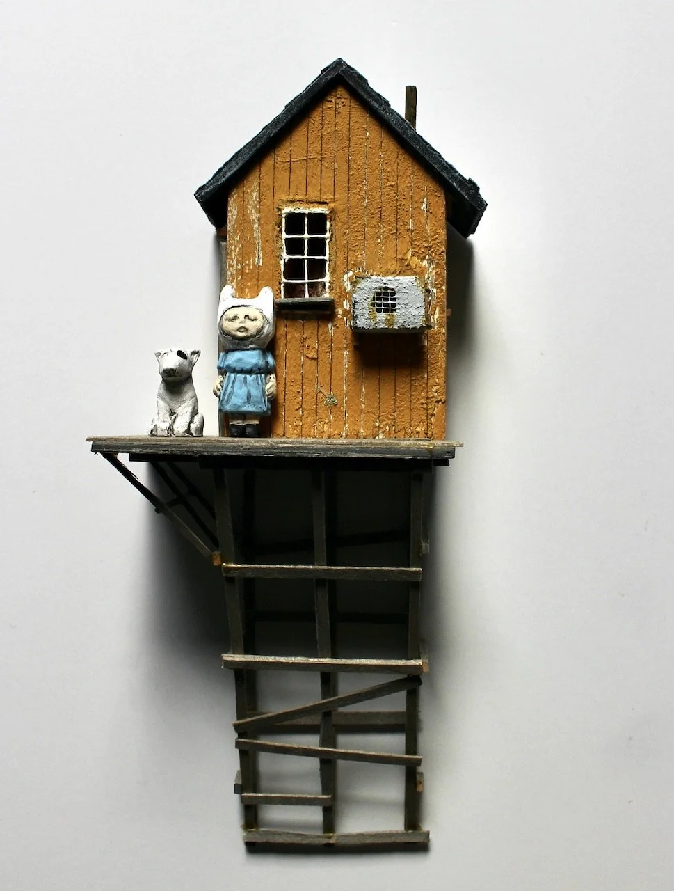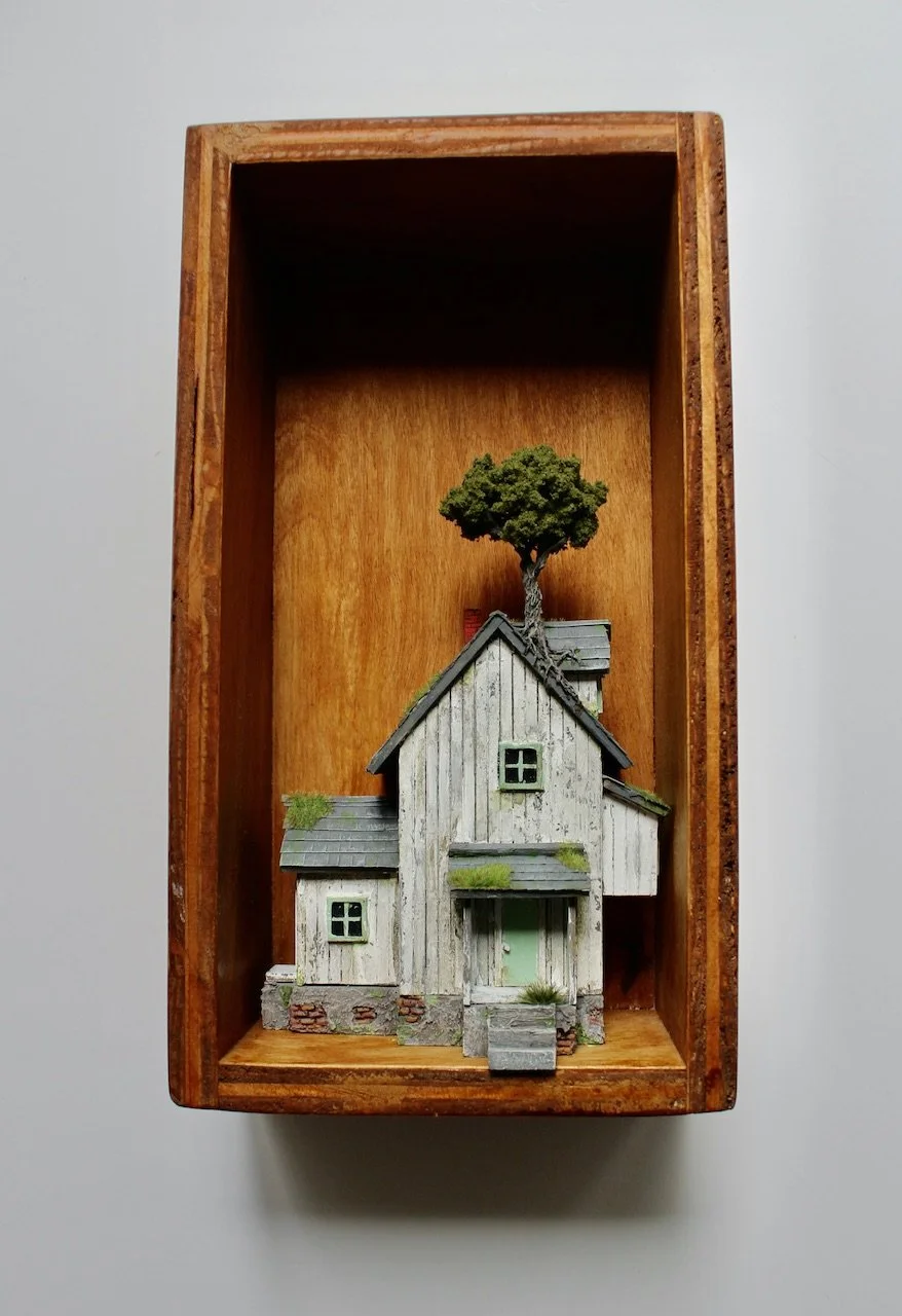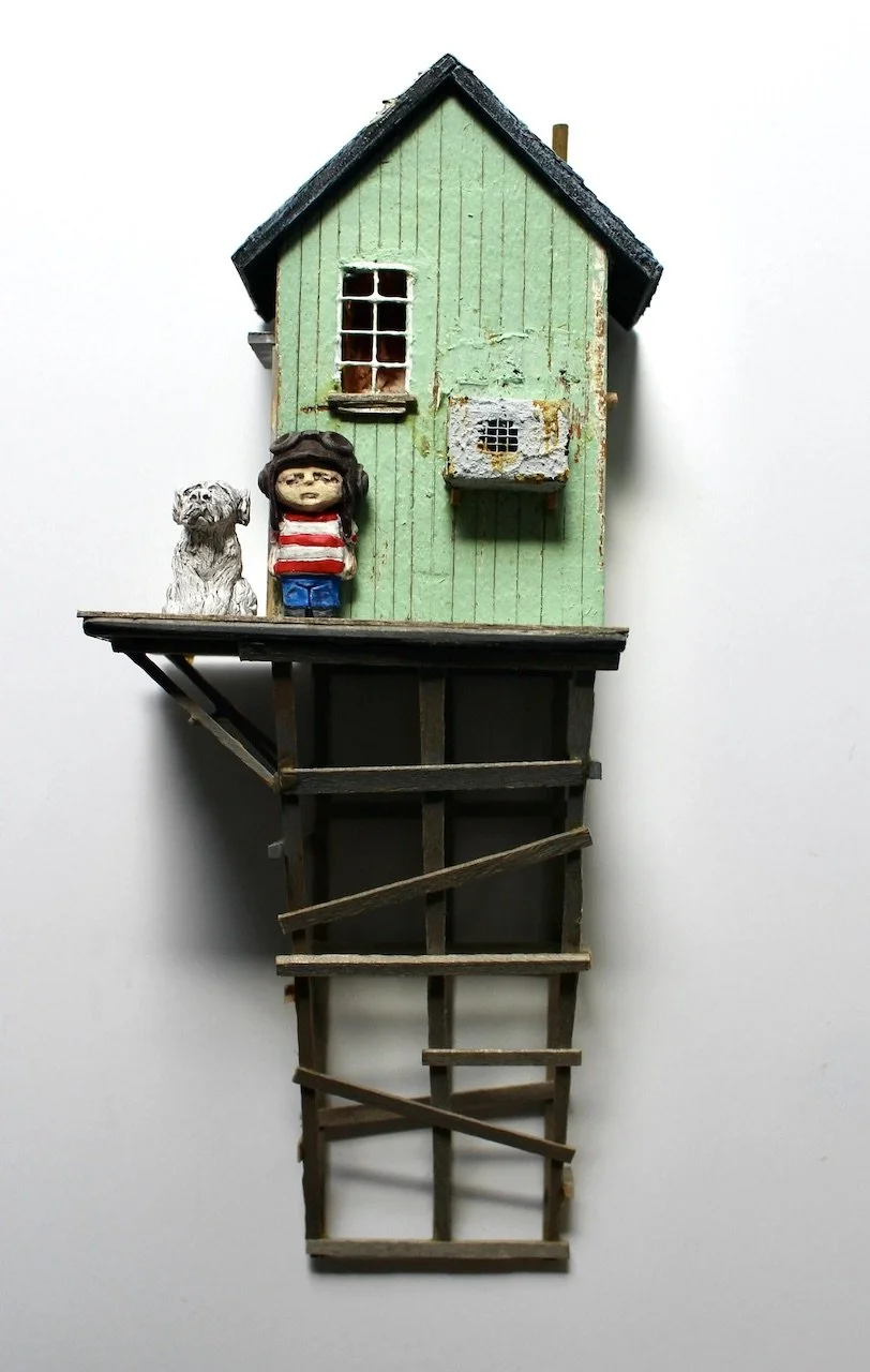 “My structural sculptures are a means for me to explore my fascination with buildings and their relationships with time, elements, and nature. I find buildings that have character far more satisfying to look at than pristine dwellings. I like to see the weathering of paint, wood, stone, concrete, brick, and mortar, as well as the power of nature to reclaim roofs with moss and plant life. Each piece is also populated with characters and creatures, perhaps new tenants who have taken up residence within the abandoned abodes in the absence of strictly human inhabitants. Or it could be that these individuals have lived there for some time, simply letting the property go a bit.