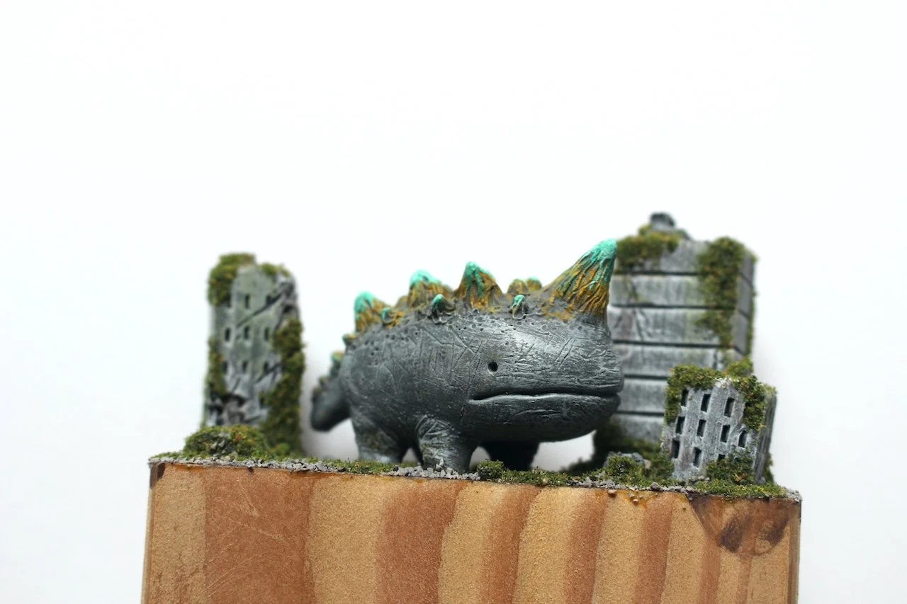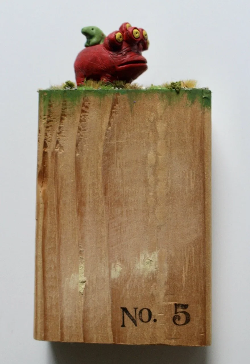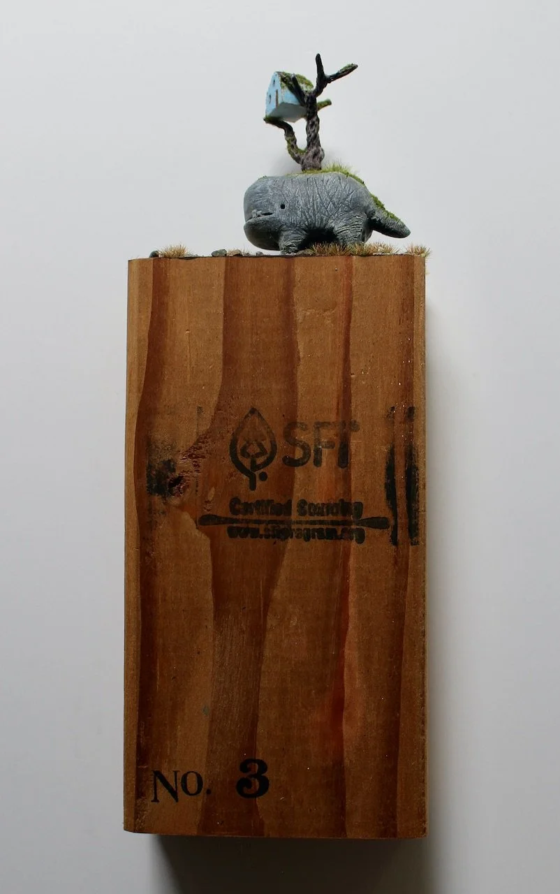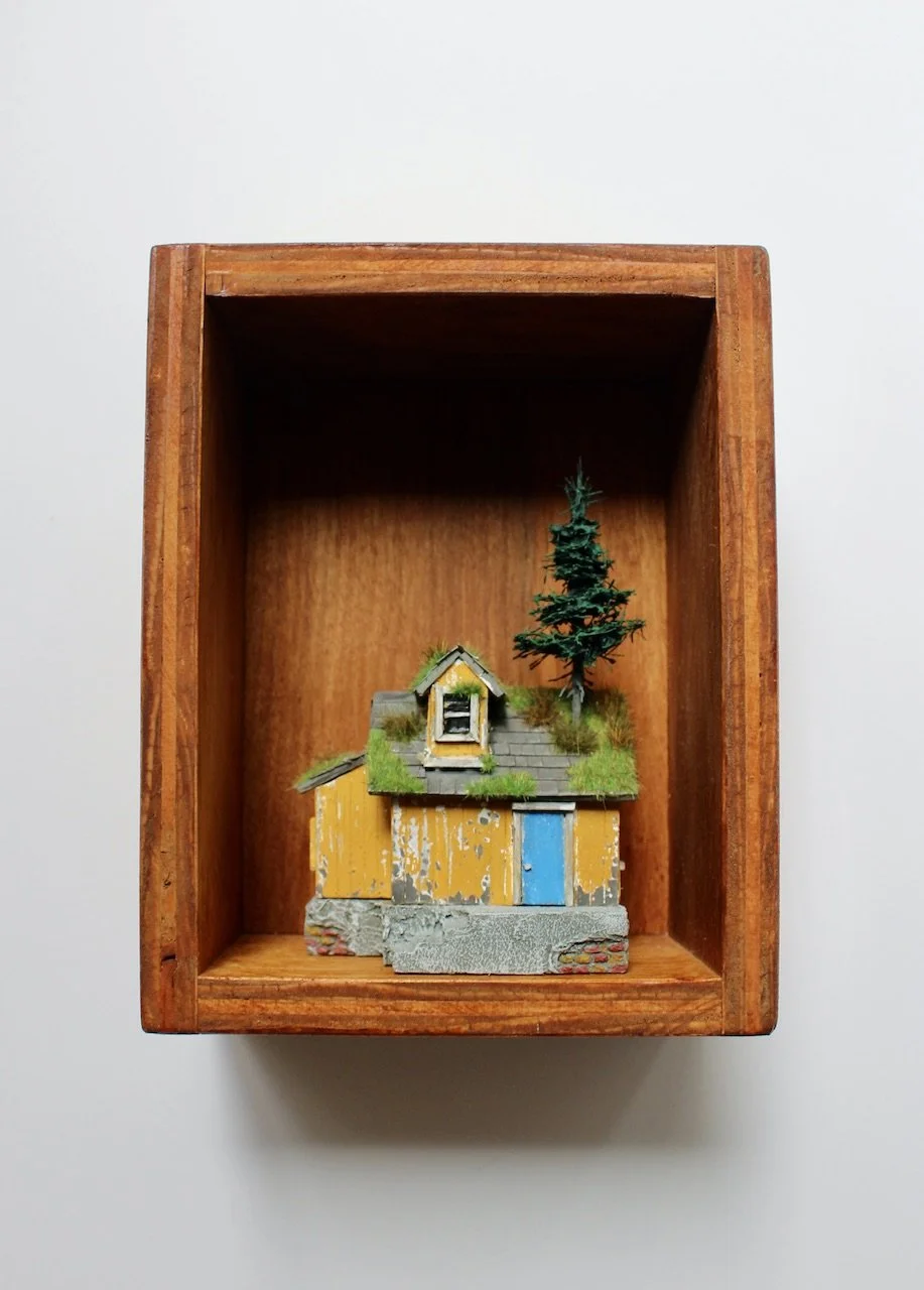 “My structural sculptures are a means for me to explore my fascination with buildings and their relationships with time, elements, and nature. I find buildings that have character far more satisfying to look at than pristine dwellings. I like to see the weathering of paint, wood, stone, concrete, brick, and mortar, as well as the power of nature to reclaim roofs with moss and plant life. Each piece is also populated with characters and creatures, perhaps new tenants who have taken up residence within the abandoned abodes in the absence of strictly human inhabitants. Or it could be that these individuals have lived there for some time, simply letting the property go a bit.